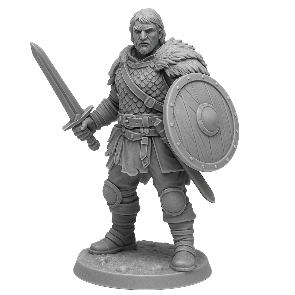 Model postaci na podstawce 25–32 mm drukujemy w technologii SLA/MSLA z żywicy ABS-like/Tough. Ustawiamy orientację pod kątem 30–45°, co zapewnia dobry kompromis między gładkością a liczbą podpór (miecz, tarcza i ramiona wymagają ich więcej). Warstwa: 0,03 mm. Po ewentualnym „hollow” (ścianka 1,2–1,6 mm) szacunkowa objętość wynosi 12–18 cm³. Czas druku pojedynczej sztuki: 3,5–5 h + wash & cure oraz postprocess po zdjęciu podpór.